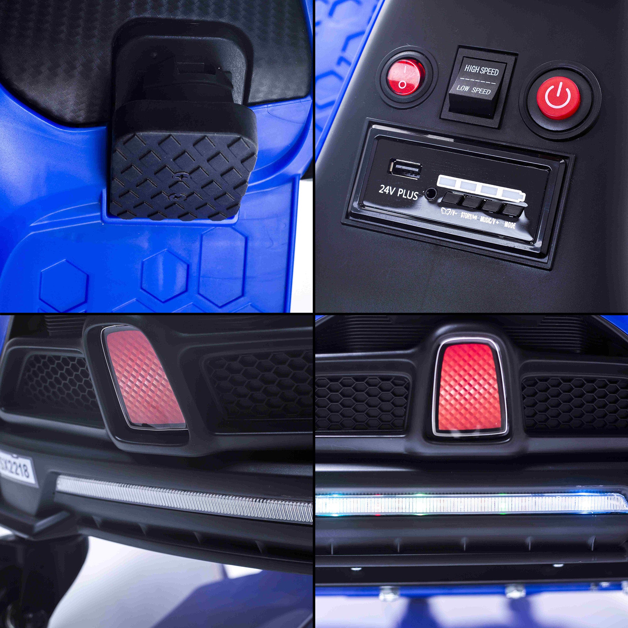 One of the standout features of the 24V VoltRacer™ is its incredible light system, featuring functioning lights all around, adding style and safety to your child’s racing experience. The integrated multimedia console, complete with USB port, Aux In, and built-in music, keeps them entertained as they cruise around.