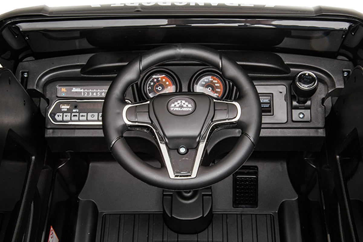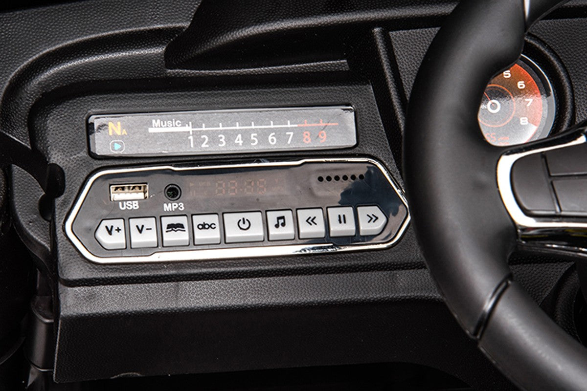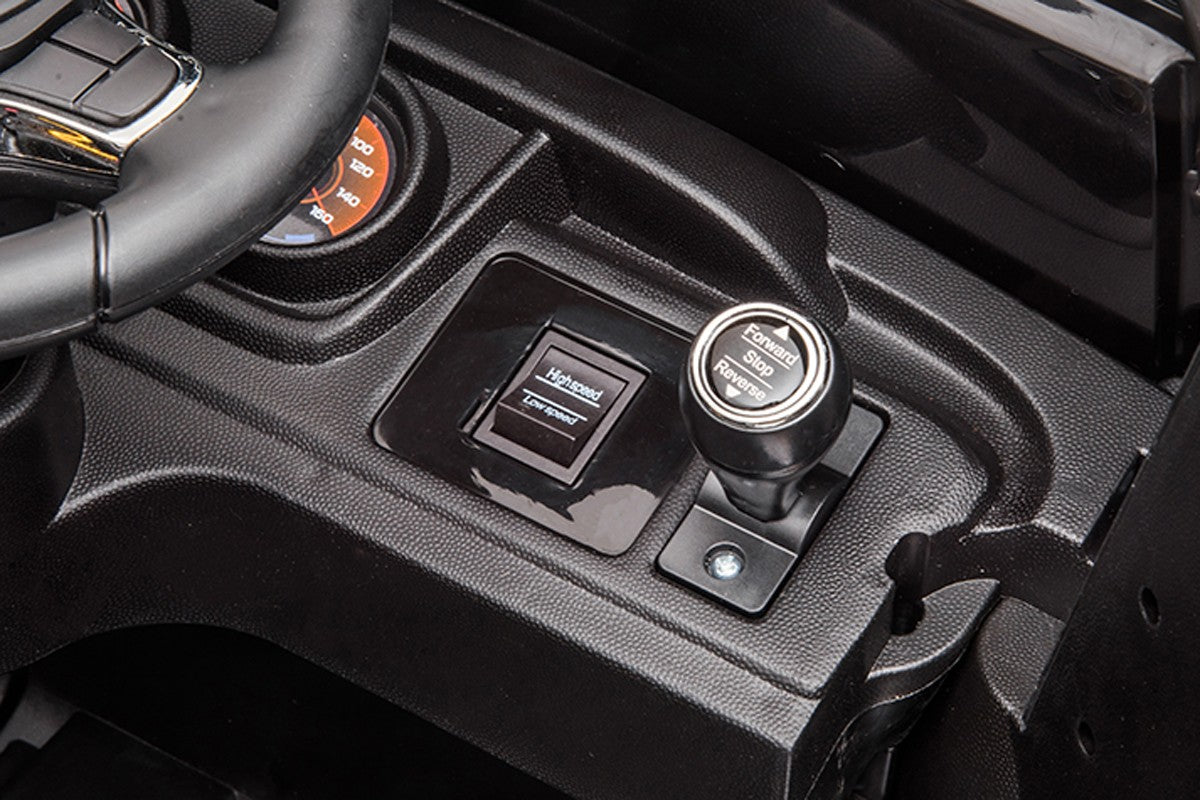 This battery powered, ride on electric car can be driven by the normal in-car controls by using the gearstick and pedal. The parental control can also be used to operate the car in forwards and reverse gears, and also turn the steering wheel left and right.