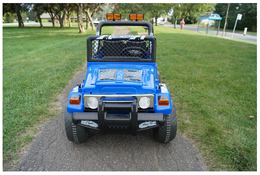 The truck jeep features working headlights, large chunky wheels, a horn, a functional remote control, and cool wing mirrors on either side of the electric ride on.