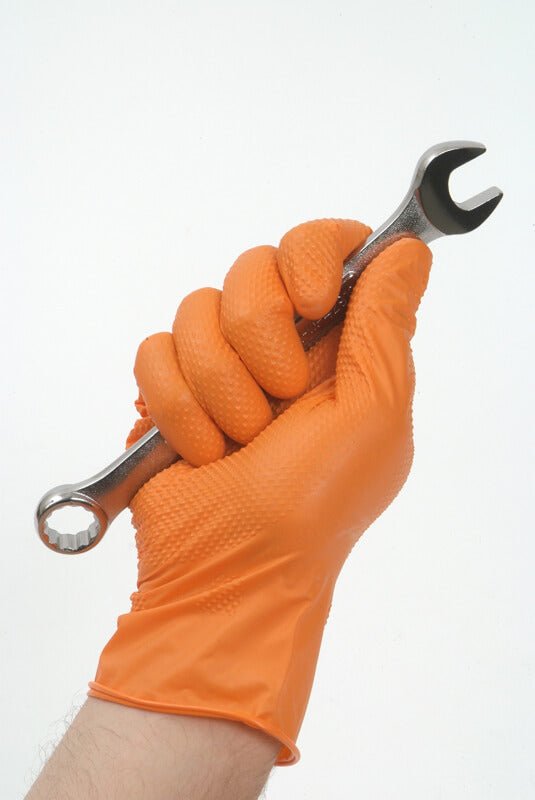 The Griptor Orange Semi-Disposable Nitrile Grip Gloves (Pack of 50) utilise a patented embossed “fish-scale” grip to bring you one of the most resilient and dexterous gloves available. Constructed from 100% NBR (Nitrile Butadiene Rubber), the Griptor Orange Gloves mould perfectly to your hands for maximum comfort and dexterity, and are impervious to chemicals and brake fluid.